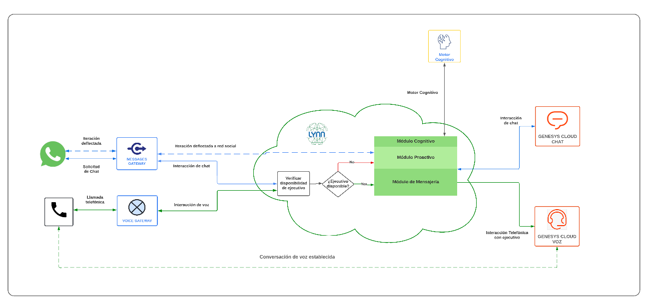 “Nuestros clientes nos contactan por canal Voz, con integración voz Lynn mediante llamadas telefónicas, un flujo automatizado en Lynn verifica la disponibilidad de ejecutivos en colas de atención Genesys Cloud voz, de no existir disponibilidad se agenda deflexión a canal de chat mediante canal WhatsApp implementando un servicio de agendamiento proactivo sobre dicho canal, las interacciones redireccionadas conservaran históricos de autoatención de la sesión y también pueden desplegar capacidades cognitivas en este flujo . Por ejemplo, si nuestro cliente consulta: “Deseo conversar con un Operador”, se detecta la intención correspondiente e inmediatamente Lynn consulta la disponibilidad sobre las colas de voz, de no existir disponibilidad se agenda su atención proactiva sobre canal de WhatsApp sobre una cola con disponibilidad.