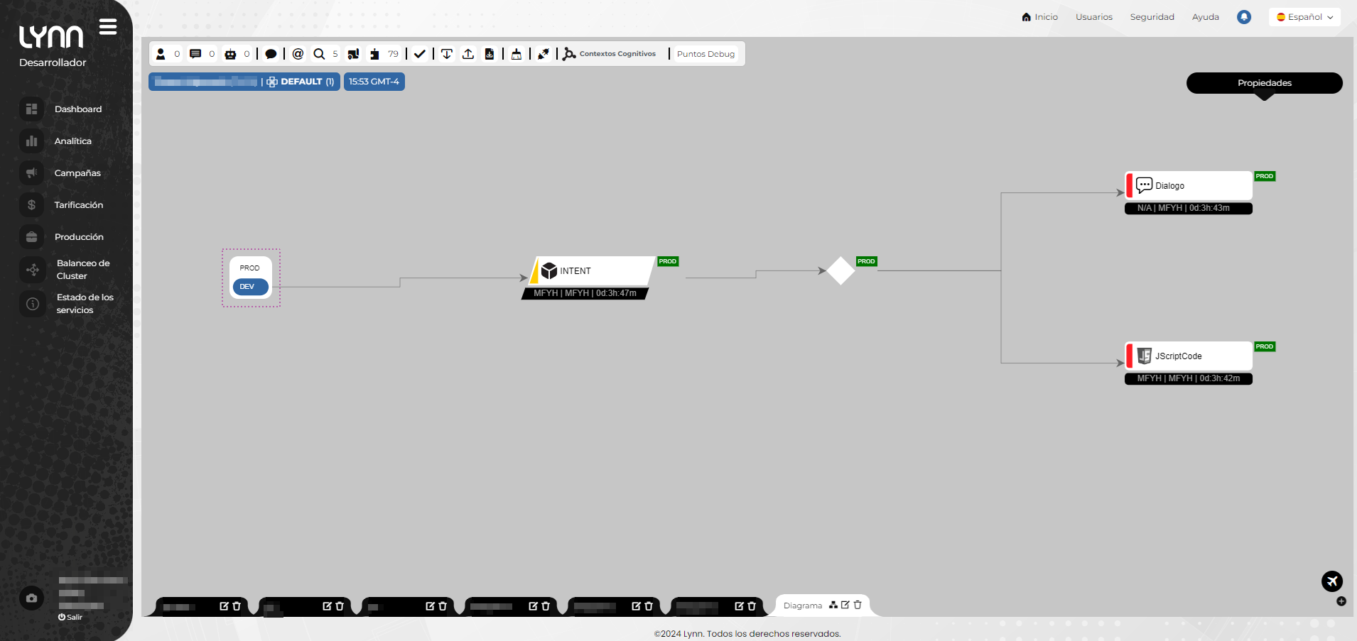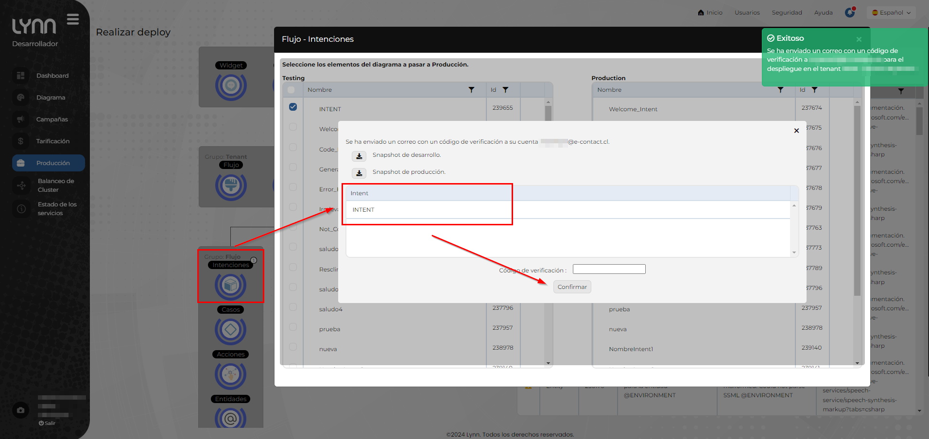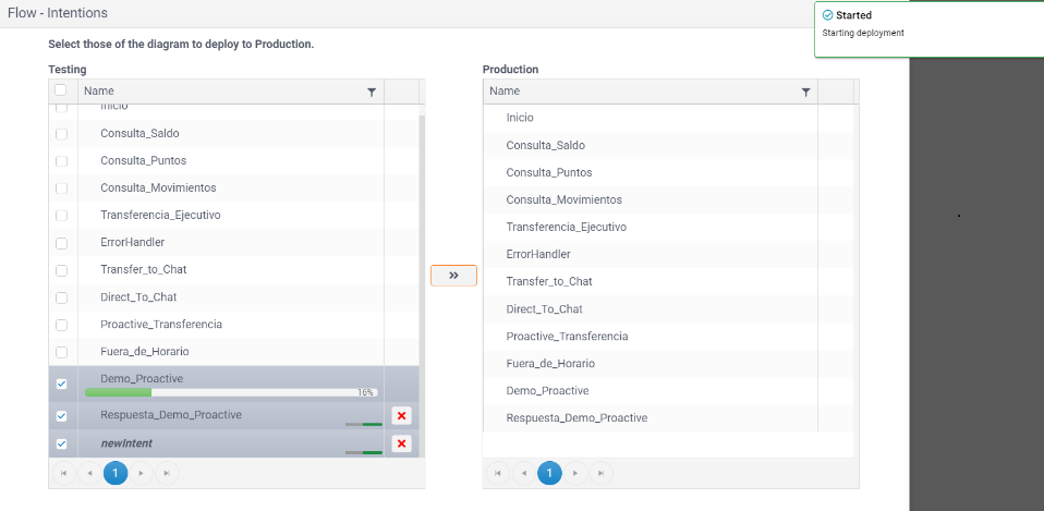 Del resultado mostrado a continuación podemos observar que, al realizar el paso a producción de una intención, también se pasará todas sus conexiones asociadas (caso y acciones). Ademas visualizara en cada elemento una etiqueta que indicara que esta en el ambiente de producción.