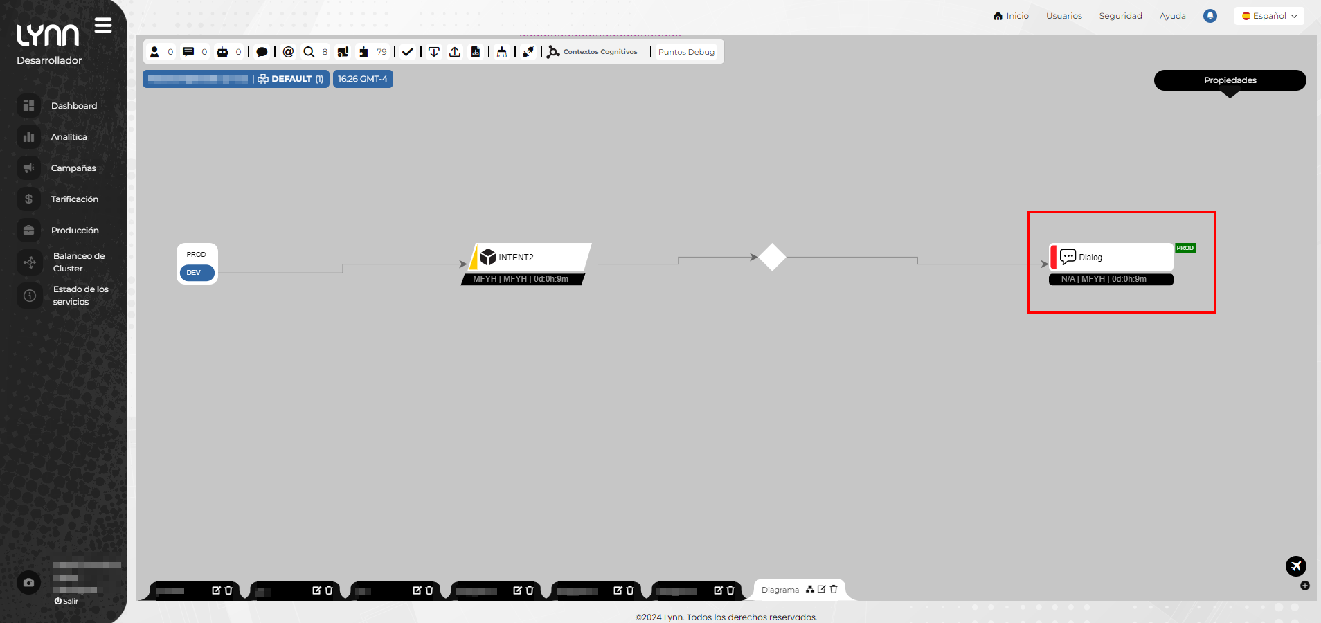 Accede a la interfaz de "Produccion" en el ambiente de desarrollo, en donde debera seleccionar la opción de intenciones dentro del organigrama y seguimos las instrucciones descritas anteriormente.