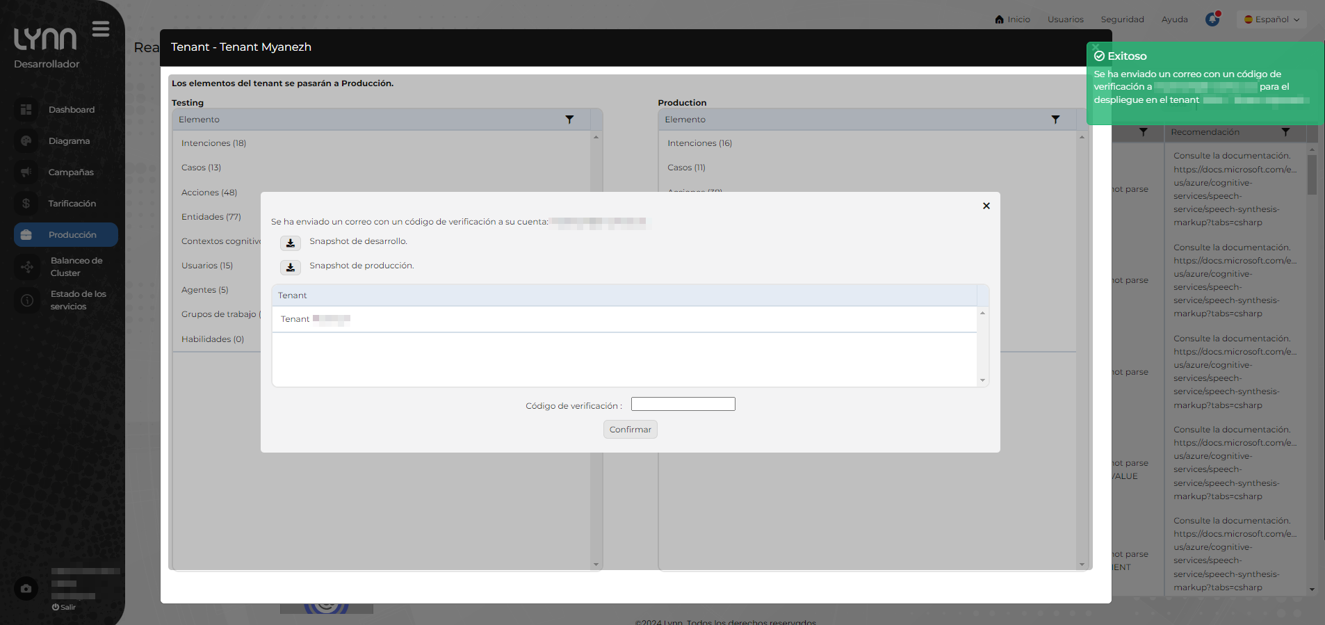 3.- Use el código de verificación en la casilla de “código de verificación”, luego confirme el paso a producción con el botón “Confirmar”.