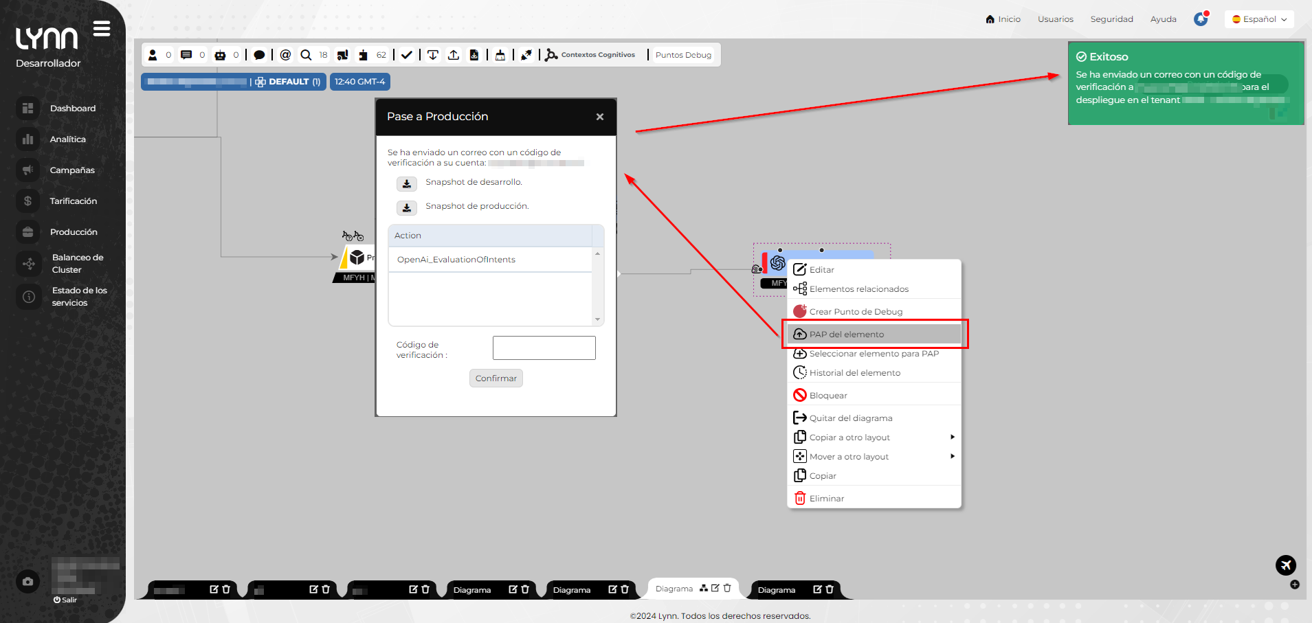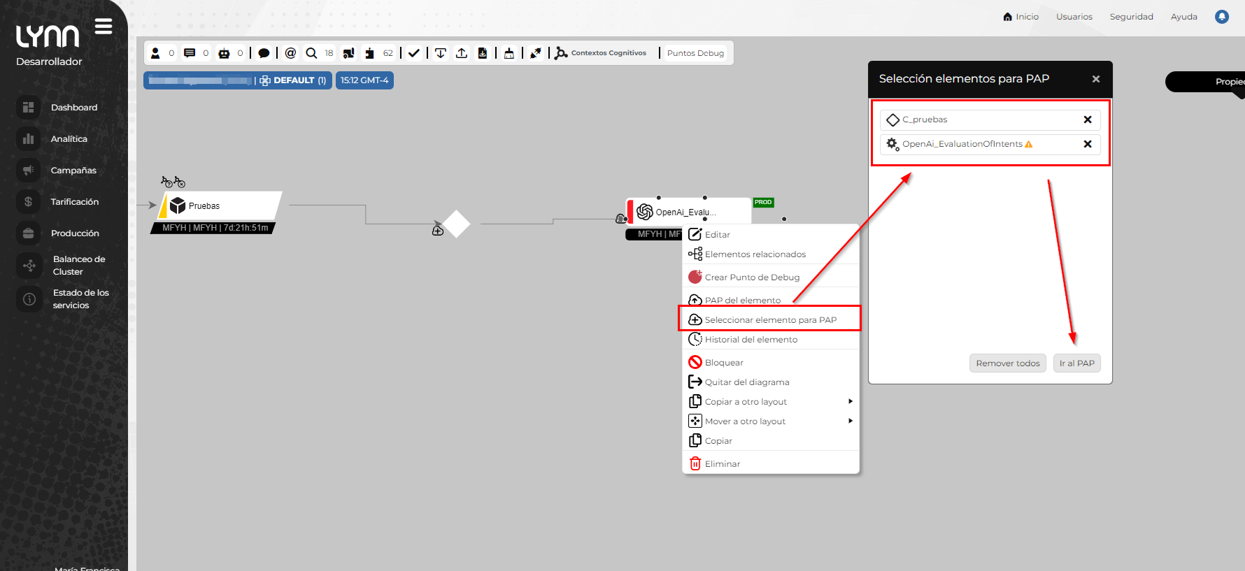 Accede a la interfaz de "Produccion" en el ambiente de desarrollo, para realizar el paso a producción del dialogo, dentro del organigrama seleccionamos la opción de acciones y seguimos las instrucciones anteriores para realizar el PAP.