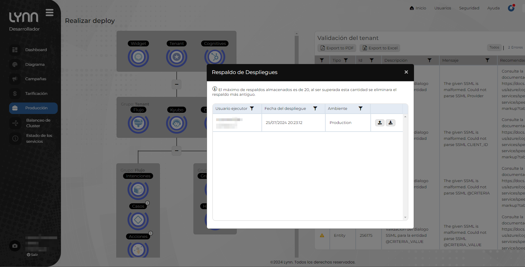 Opción respaldos: Cada vez que usted realiza un paso a producción, Lynn automáticamente guardará un respaldo del destino (Producción). En la opción “respaldos” podrá descargar y acceder a la iformacion de los últimos 20 PAP que ha realizado, superado esta cantidad se eliminara el registro mas antiguo.