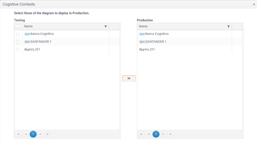 Esta opción permite promover los contextos cognitivos configurados en su tenant. Esta opción NO cambiará su contexto cognitivo evaluador en el ambiente de producción. Si requiere cambiar o actualizar el contexto cognitivo por defecto debe ir al ambiente destino y actualizarlo en el configurador de contextos cognitivos.