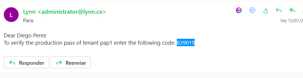 2.- Al realizar esta acción Lynn enviará un email con el código de verificación para realizar el paso a producción, revise su bandeja de entrada y busque el email enviado desde la dirección de correo oficial (administrator@lynn.cx):