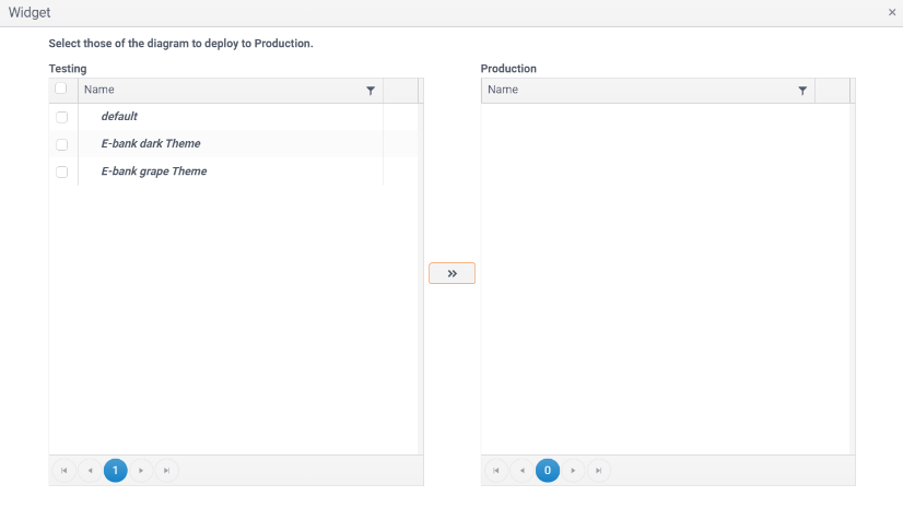 - Grupos de trabajo y habilidades: El paso a producción del grupo de trabajo y habilidades permite promover desde desarrollo a producción o de producción a desarrollo los componentes seleccionados, como en los ejemplos anteriores se debe presionar el botón “Desplegar a production”(>>) y se observara elemento en la tabla de destino (Production):