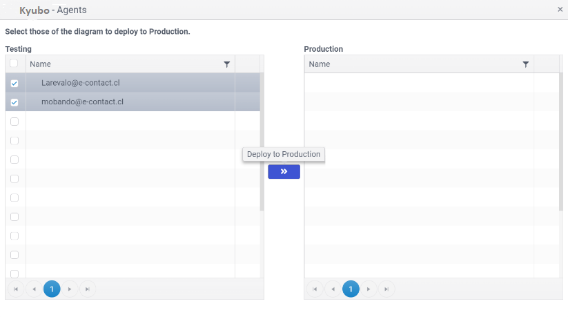- Agentes: El paso a producción de los agentes, permite promover los agentes seleccionados desde ambiente de desarrollo a producción: