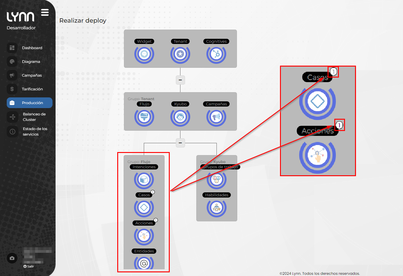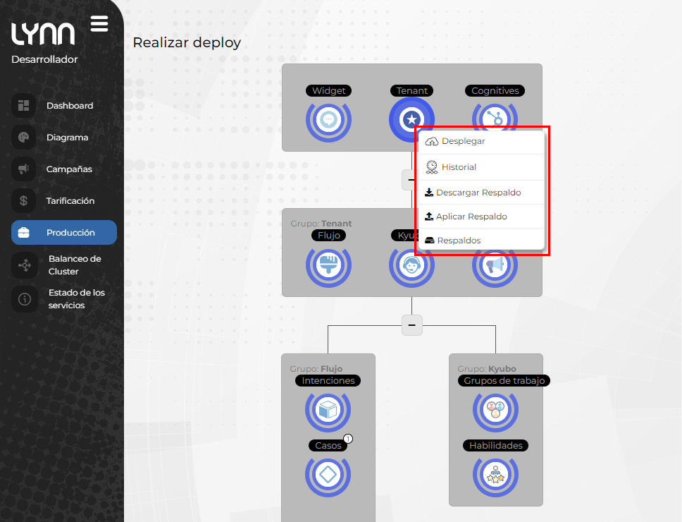 Nota importante acerca del despliegue desde producción: Si usted es usuario del Kyubo, desde el ambiente de producción seguirá teniendo la opción de promover grupos de trabajo y habilidades. Las otras opciones, quedarán bloqueadas, tal como se muestra en la imagen siguiente.