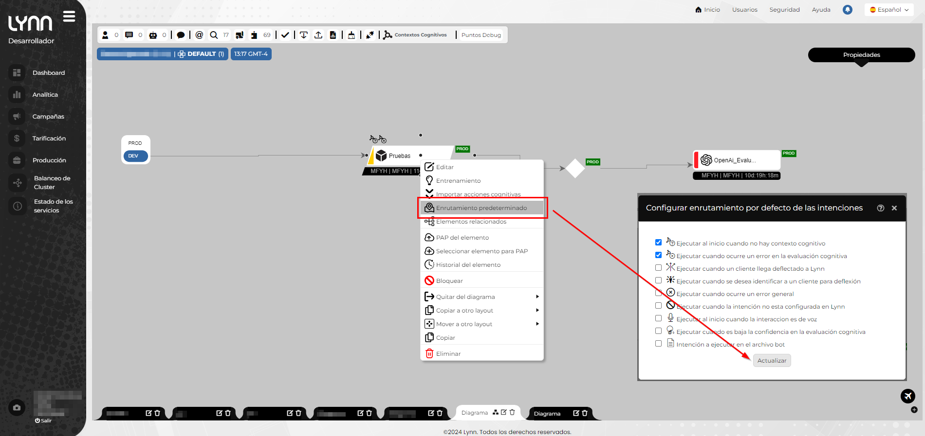 - Desde el diseñador de flujos, haga clic derecho en la intención correspondiente. Aparecerá un menú desplegable; seleccione la opción "Enrutamiento Predeterminado" y elija el comportamiento deseado.